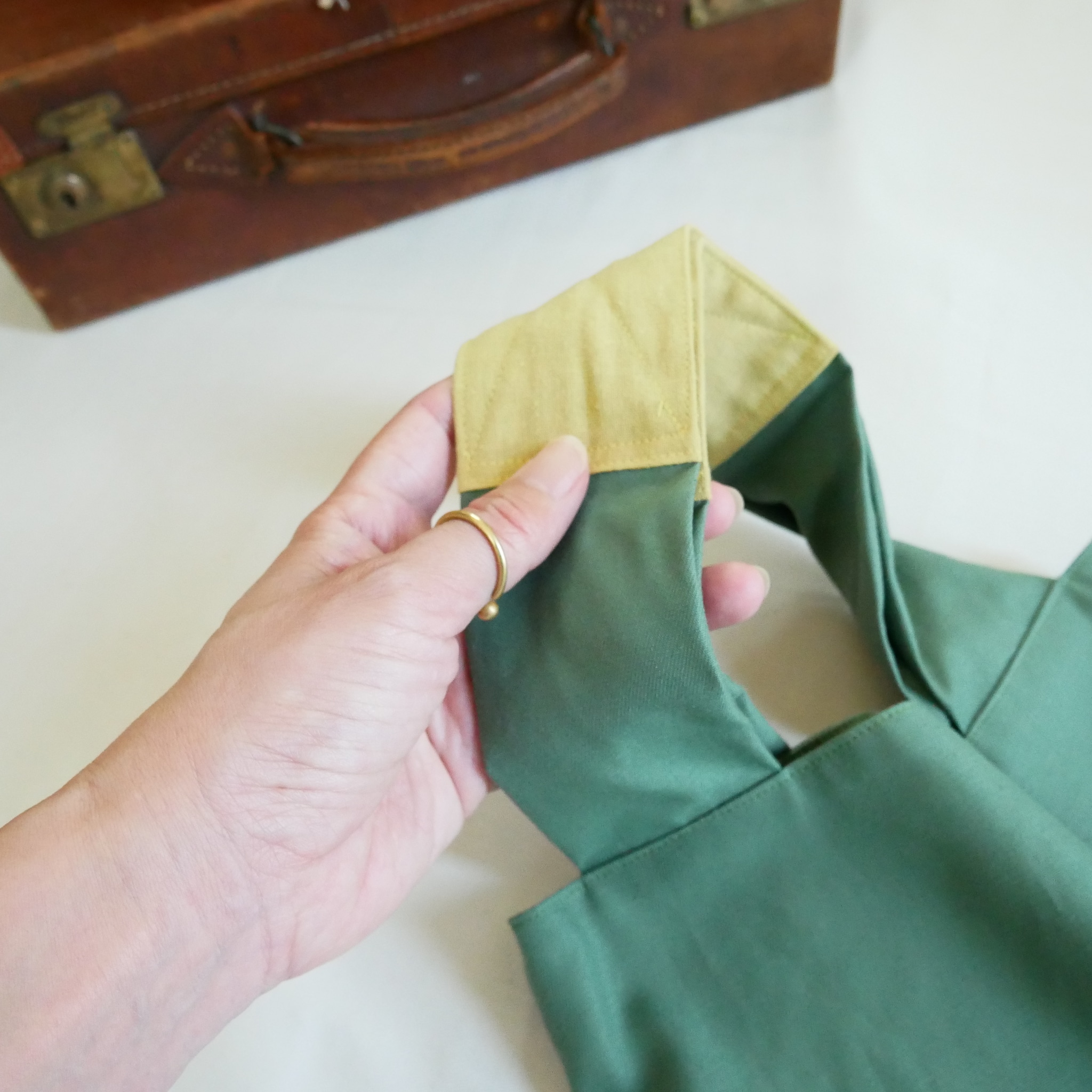 そして、本や水筒を入れると少し重めになりますが、持ち手の幅が太めなので、腕にかけた時に食い込みにくく痛くならないのもオススメポイントです。ちょうど腕に当たる部分は生地を重ねて強度を増しています。